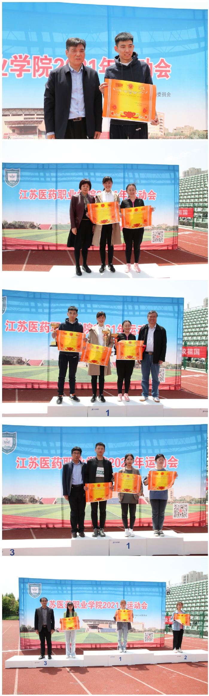 总裁判长东明宣布了竞赛团体成绩。经过2天紧张而有序的比赛,分别产生了班级男子团体总分前四名、班级女子团体总分前八名、班级团体总分前八名、学院团体奖前三名、体育道德风尚奖两名和优秀组织奖一名以及工会小组奖前六名。医学技术学院、药学院、护理学院分获此次运动会团体总分的前三名。医学技术学院、药学院获体育道德风尚奖,护理学院获优秀组织奖。(党委宣传部马冬云供稿、蔡万四摄影,胡勇核稿)