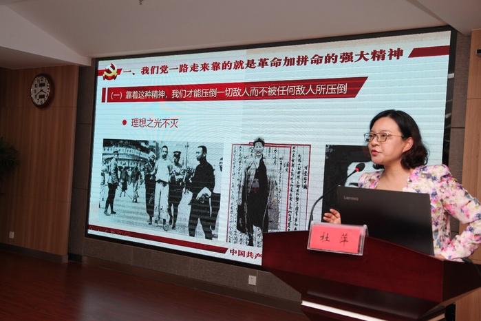 杜萍副教授以“中国共产党在长期奋斗中铸就的伟大精神”为题,从“我们党一路走来靠的就是革命加拼命的强大精神”、“百年非凡奋斗构筑起中国共产党人的精神谱系”、“让伟大精神放射出新的时代光芒”三个方面展开讲述了党的百年奋斗历史,并结合自己的感悟进行了深入剖析。