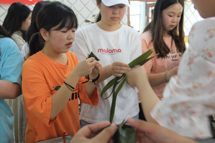 学生相互学习包粽子的技巧