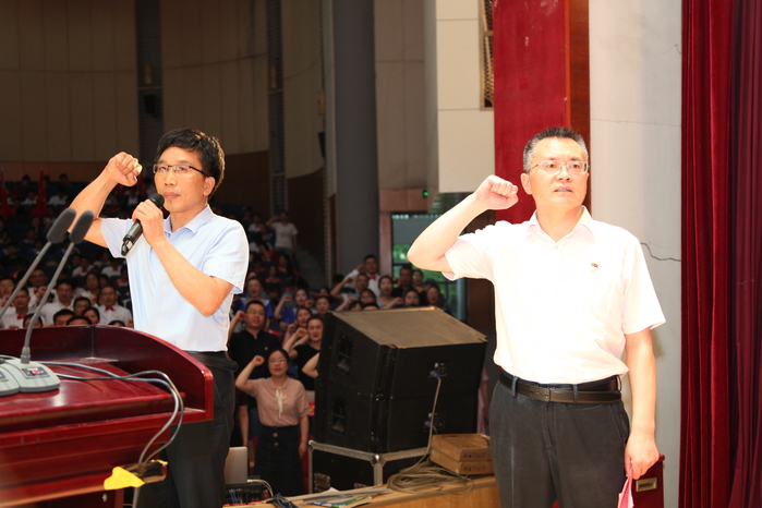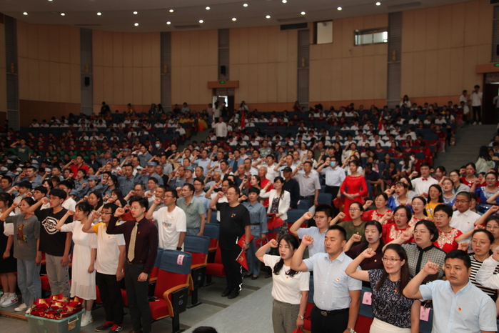 大会在庄严的国歌声中拉开序幕。党委委员、组织部部长陈洪魁带领新入党党员面向党旗庄严宣誓,全体老党员重温入党誓词,铿锵有力的宣誓声响彻礼堂。