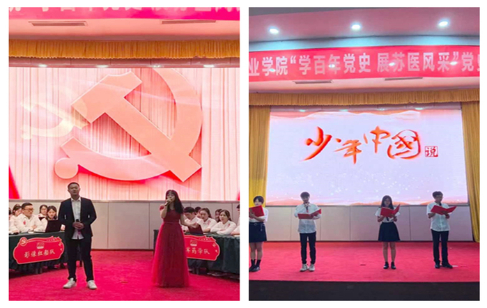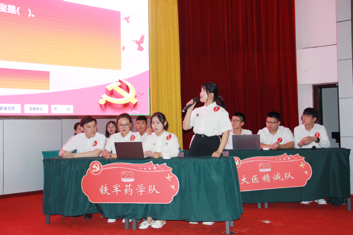 本次竞赛6支队伍同台竞技,分别是来自药学院的铁军药学队、医学影像学院的影像红船队、医学院的大医精诚队、医学技术学院的红旗先锋队、康复医学院的不忘初心队、护理学院的红心向党队。现场竞赛分为必答题、抢答题、风险题共三个环节,比赛开始前各参赛队伍进行了队名、口号风采展示,展示了团队饱满的精神面貌,现场气氛热烈。比赛现场选手们全神贯注、踊跃作答,气氛紧张而热烈。必答题环节,各队平分秋色,比分不相上下。抢答题环节,竞争激烈,大家静息凝神,不愿放过每一次机会,观众席掌声雷动迎来了比赛高潮,比分逐渐拉开差距。比赛间隙,李思颖和高华带来的歌曲《我爱你,中国》,掀起了观众们的热情。最刺激、最具挑战性的风险题,各参赛团队充分展示了自己丰富的知识储备,密切合作敏捷对答互不相让,将比赛过程一次次推向高潮,展示了一场精彩纷呈的党史知识“较量”。随后,夏松祥、刘润杨、朱欣悦、许雯雯四位同学带来了精彩的朗诵《少年中国说》,令人激昂振奋。