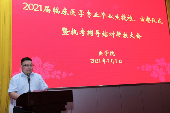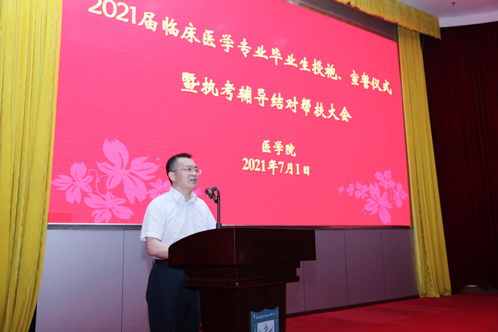 7月1日下午,医学院在国际会议中心举行了2021届毕业生授袍、宣誓仪式暨执业助理医师考试辅导结对帮扶仪式。院长陈国忠、副院长侍杏华,医学院党政班子全体成员、执考辅导老师参加大会。大会由医学院党总支书记周文超主持。