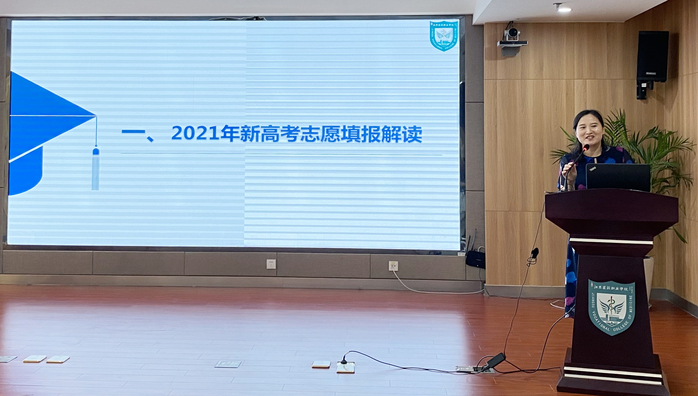 会上,招生办副主任许凤围绕2021年江苏新高考实施方案、招生政策、志愿填报技巧、考生常见问题回答技巧等方面做了详细讲解。