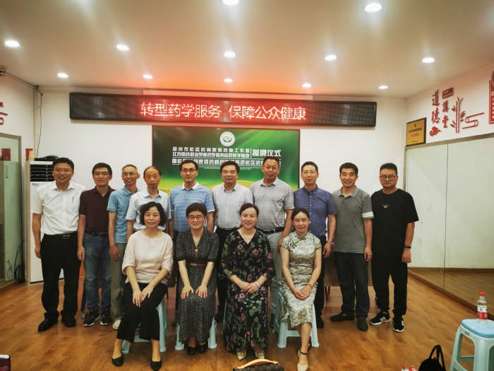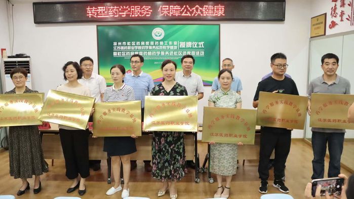 为贯彻落实国务院办公厅《关于深化产教融合的若干意见》(国办发〔2017〕95号),提高我校药学院学生的基层药学服务岗位胜任力,在扬州市场监督管理局的支持下,江苏医药职业学院与国药控股国大药房扬州大德生连锁有限公司、国药控股扬州大药房连锁有限公司、扬州市百信缘医药连锁有限公司、扬州市同康泰大药房连锁有限公司、江苏联环健康大药房连锁有限公司、扬州苏羊医药有限公司、扬州众成堂医药连锁有限公司7家企业共建药学服务实践教学基地,7月16日上午在扬州邗江区双桥社区举行授牌仪式。