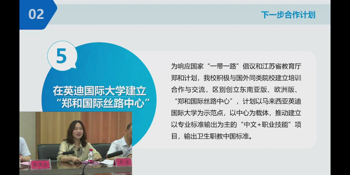随后,国合处处长罗琼发言总结了两校合作取得的进展,并就博士培养与联合科研、线上课程、中外合作办学、“郑和国际丝路中心”建设等合作项目计划作具体汇报。英迪国际大学中国区代表王晓怡表示,两校在办学方面有诸多共同点,专业群设置吻合,合作契合度高,她将全力配合支持双方的合作,期盼早日取得硕果。我校教务处副处长魏志明作为英迪国际大学在读博士生代表发言,分享了自己攻读博士以来的经历和体会。最后,双方就合作项目细节展开了深入讨论,并以“云合影”结束了此次会议。