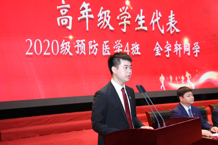 典礼在庄严的国歌声中拉开帷幕。2021级护理3班丁志伟同学和2020级预防4班金宇轩分别表新、老生学生作真情发言。丁志伟号召同学们以优秀的校友为榜样,志存高远、脚踏实地,担当起医务人员“敬佑生命、救死扶伤、甘于奉献、大爱无疆”的职责和使命,努力成为新时代“最可爱的人”。金宇轩结合自己一年多在苏医的学习经历,为学弟学妹分享了学习心得,并祝愿新生们秉承行方智圆的校训,脚踏实地,挥洒汗水,放飞梦想!药学院田友清教授作为教师代表,勉励新生做实干家和独立人,拥有有精气神和自信心,珍惜大学时光,勤奋学习,立志成才。