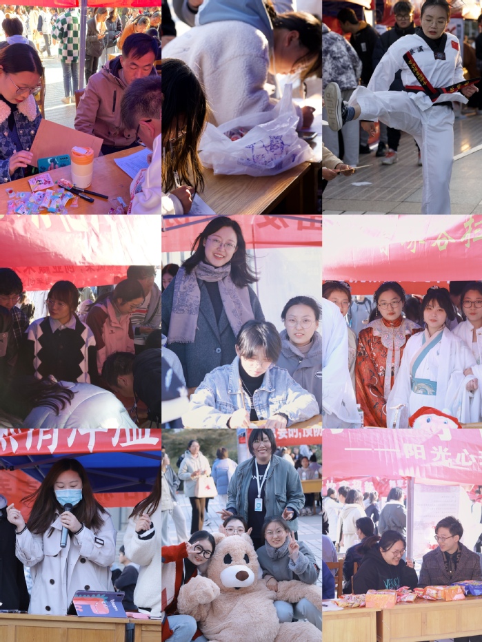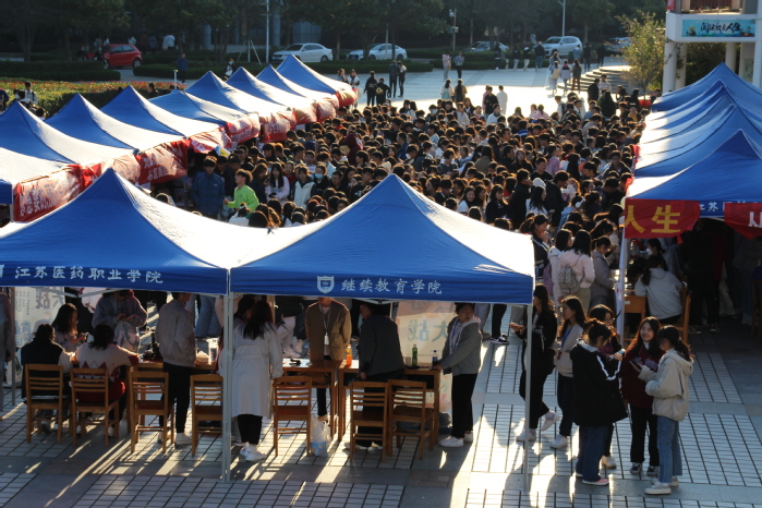 各社团迎风飞舞的标语,言简意赅地表达了社团特色及对新生的欢迎:“花径不曾缘客扫,蓬门今始为君开”的子衿汉社;“协手同行”的阳光心理协会;“青春有你,‘药’你来习”的药趣联盟社;“一起进入二次元动漫世界”的漫妖同盟社。音乐协会、舞蹈协会的火热表演传递出青春的活力;子衿汉社的同学身着汉服,云髻峨峨,举手投足间传递出古风的魅力;书法协会、跆拳道社等社团现场秀技,送漫画、送书签、送糖果、送祝福等细致的策划吸引同学们纷纷驻足,将招新现场推向高潮。