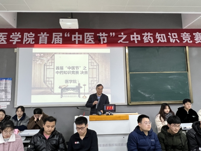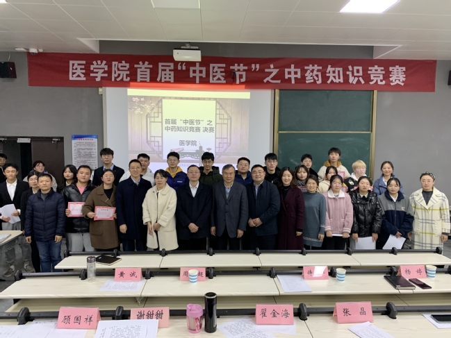 为弘扬中医药文化,夯实中医药理论,锻炼中药方剂技能,营造和谐浓厚的学习氛围,12月3日,由医学院举办的第一届“中医节”之中药知识竞赛决赛在教学楼D206教室成功开展。副院长侍杏华,医学院党总支书记周文超、副院长黄诚、副书记杨婷出席活动。经过中药知识竞赛初赛选拔,18名选手成功晋级,分为6个参赛组同台竞技。医学院中医专业5位博士受邀担任评委,100余位学生参加了活动。