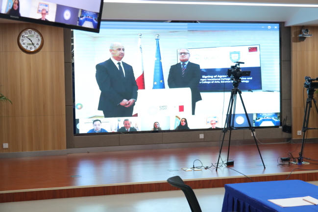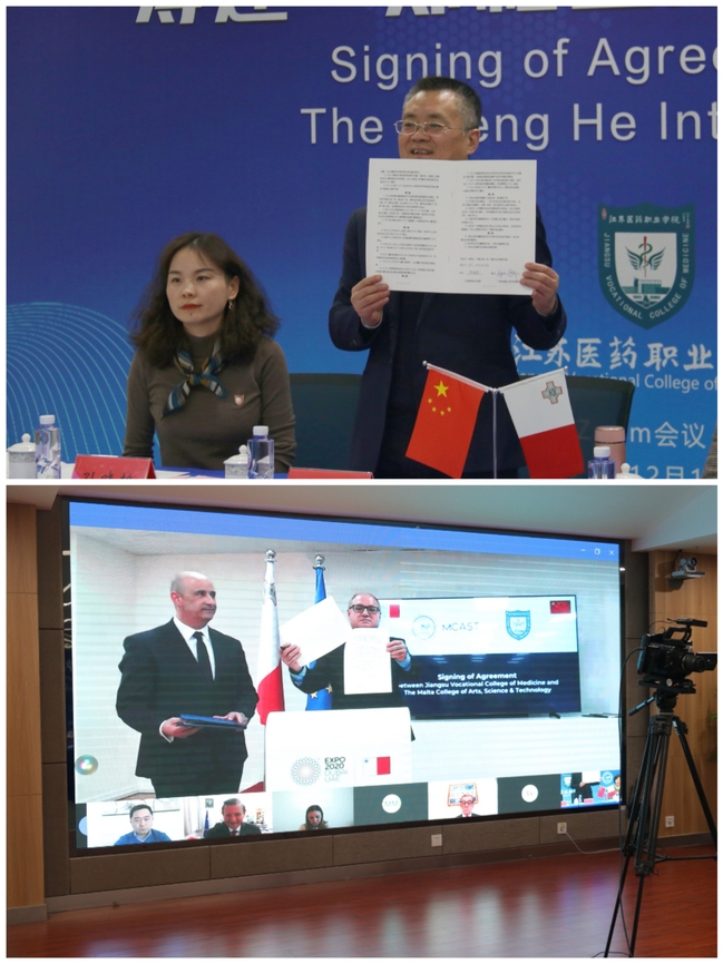 12月14日下午,我校在学术会议中心第三会议室与马耳他国立艺术科学技术学院举行了筹建“郑和国际”丝路中心线上签约仪式,本次签约在迪拜世博会教育峰会进行全球直播。马耳他驻华大使卓嘉鹰(John Aquilina)、马耳他国立艺术科学技术学院校长约阿希姆·卡列哈、副校长斯蒂夫·维拉、“郑和国际”丝路中心建设专家顾问布苏蒂尔博士、马耳他华联会副主席陈巨恒,我校院长陈国忠、副院长高璀乡、国合处及相关二级学院负责人出席签约仪式。仪式由国合处负责人主持。