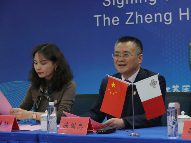随后,马耳他驻华大使卓嘉鹰对本次签约表示衷心的祝贺和肯定,他表示在疫情背景下,双方仍能打破交流上的藩篱达成筹建协议,是非常难得的。卓大使在参会前对我校进行了深入调研,充分肯定了我校建校八十周年来取得的瞩目成绩,他希望两校以“郑和国际”丝路中心为载体,建立长期、稳定、有效的合作,通过双方的共同努力,将“郑和国际”丝路中心建成中马两国之间的标杆合作项目,让中马友谊更加深入人心,以此向中马建交五十周年献礼。