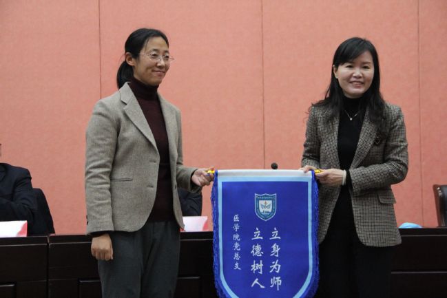 会前,医学院党总支全体教师在“廉洁从教,从我做起”承诺书前举行签字仪式。会上,全体人员集中学习了《新时代高校教师职业行为十项准则》。随后,新进教师代表、基础医学部迟寅秀博士和2020年度学校“师德标兵”马林伟老师分别进行表态发言;校纪委委员、党办院办主任张慧与教师代表李珊珊博士进行师德传承授旗仪式。