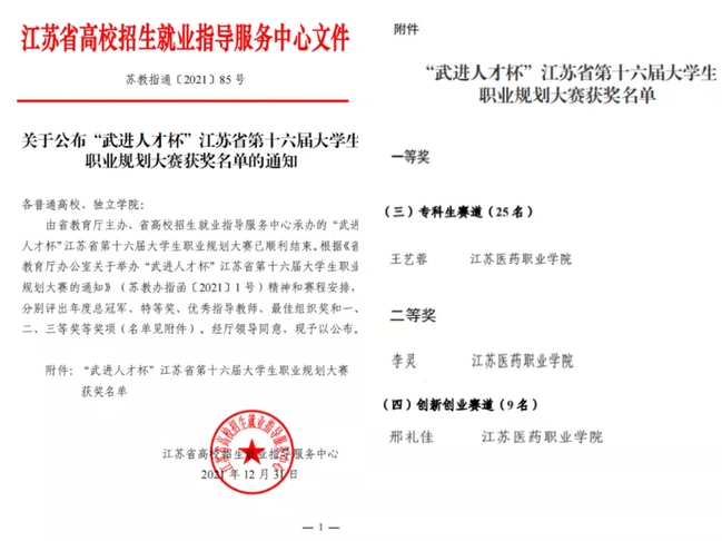 12月30日,由江苏省教育厅主办、江苏省高校招生就业指导服务中心承办的“武进人才杯”江苏省第十六届大学生职业规划大赛总决赛落下帷幕。我校护理学院王艺蓉同学获专科生赛道一等奖,医学院李灵同学获专科生赛道二等奖,药学院邢礼佳同学获创新创业赛道二等奖,取得了我校在该赛事的历史总体最好成绩。