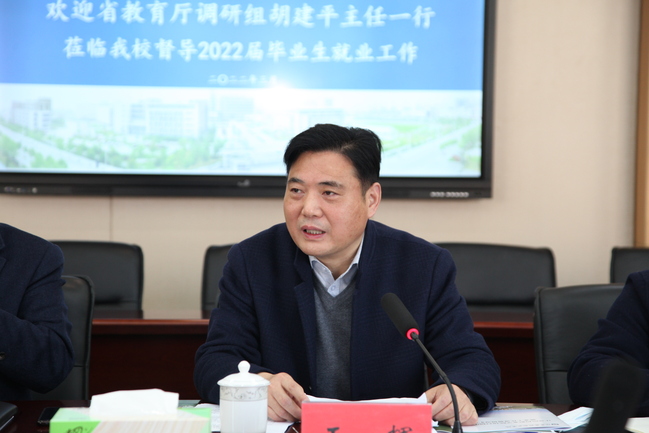 3月10日上午,省高校招生就业指导服务中心胡建平主任一行来我校调研指导2022届毕业生就业工作。院长陈国忠,副院长王辉,教务处、招生就业办公室负责人,各二级学院党总支书记参加调研会议。会议由院长陈国忠主持。