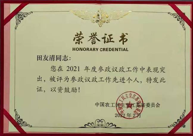 我校田友清教授被农工省委评为2021年度“参政议政工作先进个人”