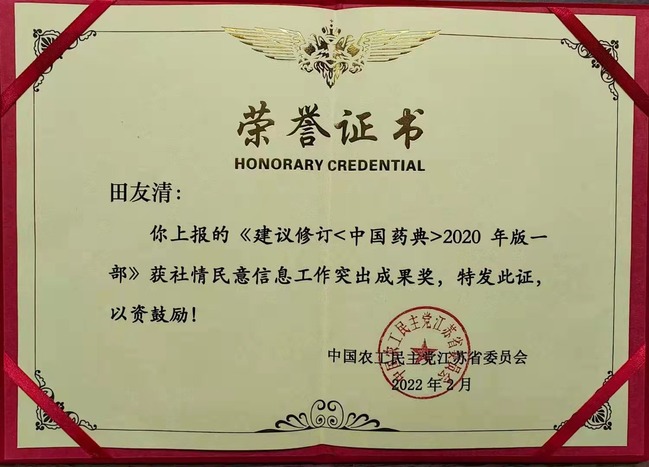 近日,农工党江苏省委和盐城市委传来喜讯,我校田友清教授因在参政议政工作中表现突出,被农工省委评为2021年度“参政议政工作先进个人”。同时,其撰写上报的《对<中国药典>2020年版一部修订的几点建议》获社情民意信息工作突出成果奖,并被省政协采用。