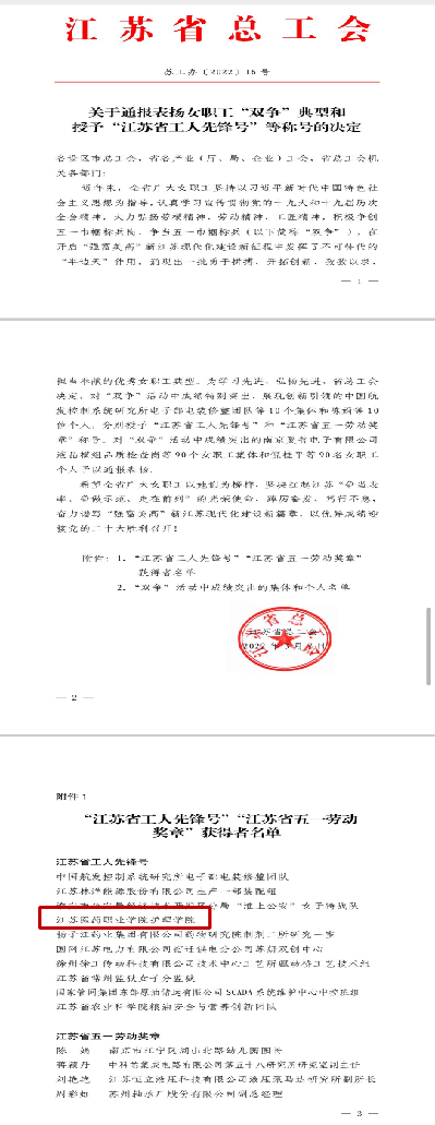 护理学院荣获“江苏省工人先锋号”荣誉称号