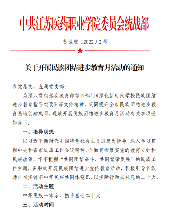 精心谋划,确保活动有序开展。研究制定了《关于开展民族团结进步教育月活动的通知》,在党委组织部、统战部的综合协调下,各部门、各学院陆续召开推进会、部署会,专题研究工作方案,细化任务举措,确保了民族团结进步教育月活动开好头、起好步、出实效。