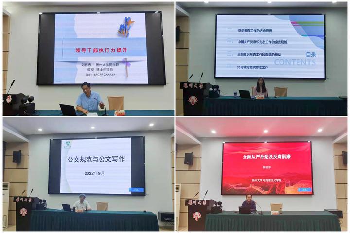 此次培训分为理论教学和实践教学两个模块。扬州大学商学院副院长刘伟忠教授作《领导干部执行力提升》专题讲座,从“执行力的构成、分类及重要性”等方面详细阐述了作为二级单位内设机构负责人,如何培养执行思维能力、高效提高执行力。马克思主义学院王雪婷教授从“意识形态工作的内涵辨析、中国共产党意识形态工作的宝贵经验、当前意识形态工作面临的挑战、如何做好意识形态工作”等方面作《当前意识形态工作的形势与使命》专题讲座。文学院孙永良副教授从“公文规范、公文基本要素及其写作要求、公文写作的提升策略”等方面作《公文规范与公文写作》专题讲座,阐述了文书写作必备的能力基础,分享了文书写作的通用技巧。形势与政策教研部主任林祖华教授作《全面从严治党及反腐倡廉》专题讲座,详细梳理了全面从严治党的理论和现实依据,回顾了中国共产党从严治党的发展历程,阐述了中国共产党全面从严治党在新时代的新部署。培训期间,全体学员结合培训内容进行了交流研讨,并赴中国大运河博物馆进行了现场教学。