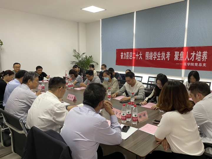 在佳富村村部会议室,医学院党总支党员教师、毕业生代表举行了座谈。会上,医学院党总支书记周文超领学了《习近平谈治国理政(第四卷)》第三章节《始终坚持人民至上》内容;医学院负责人、基础医学部负责人对近几年学生执助考试成绩及执考辅导情况进行了分析汇报,参与执考的党员教师和毕业生代表分别进行发言。陈部长强调,希望二级学院正确处理学生校内教学和执考辅导、学校教学与临床教之间的关系,坚持党建引领,以党风建设统领教风、学风、班风建设。