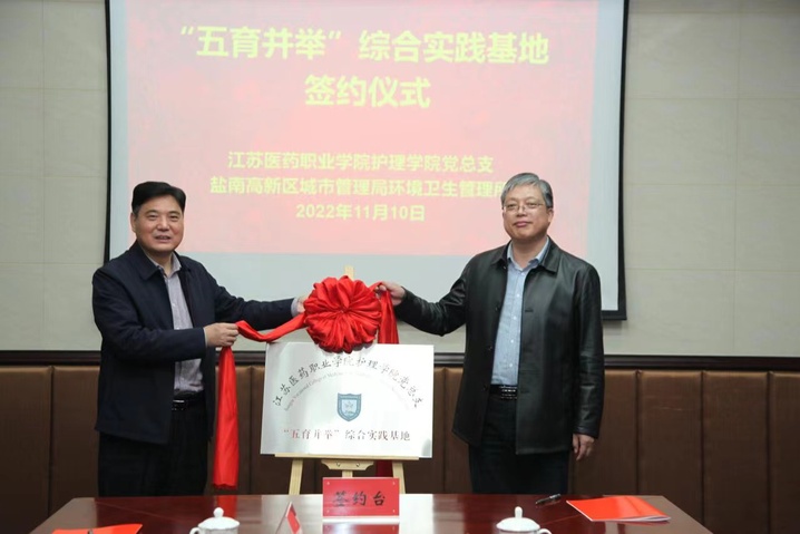 随后,护理学院党总支书记何曙芝与盐南高新区环境卫生管理所金华军所长签订了“五育并举”综合实践基地合作协议,我校副院长王辉与盐南高新区城市管理局商兆东副局长共同为“五育并举”综合实践基地揭牌,宣布了“五育并举”综合实践基地正式挂牌运行。