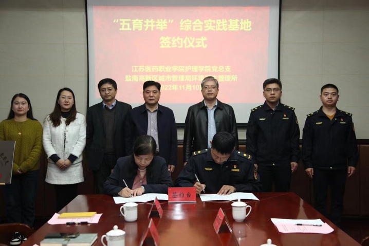 为进一步贯彻落实立德树人根本任务和“五育并举”育人理念,为大学生综合实践活动提供平台。11月10日,护理学院党总支与盐南高新区环境卫生管理所在行政楼308会议室举行了“五育并举”综合实践基地签约仪式。盐南高新区城市管理局商兆东副局长、盐南高新区环境卫生管理所金华军所长、蔡立富副所长、盛士昌办事员,我校副院长王辉,教务处处长王庭之,护理学院党总支书记何曙芝,护理学院党总支纪检委员、副院长吕颖,护理学院党总支组织委员、团总支书记汪艳参加签约仪式。