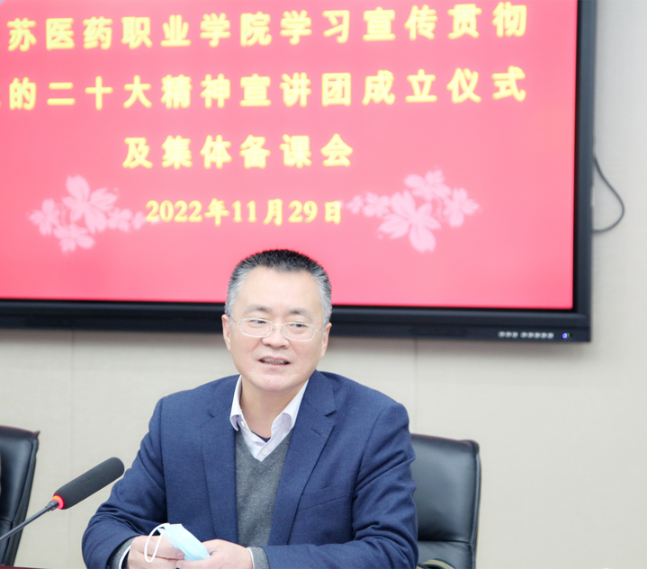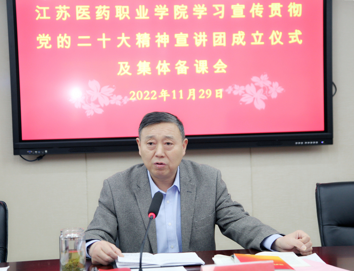 会上,胡部长首先宣读了《关于成立江苏医药职业学院学习宣传贯彻党的二十大精神宣讲团的通知》,并介绍了学校党的二十大精神宣讲的总体安排。他强调,大家要深刻认识到党的二十大精神宣讲工作的重大意义,让党的二十大精神“热气腾腾”滋润师生心田。