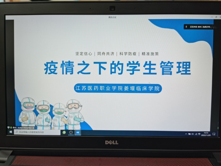 首先,医学技术学院就探索构建“三走进 三反馈”驻点班学生管理机制作重点汇报;医学院以五位一体、思政育人为角度,汇报了实习生管理工作的现状、举措以及下一步工作的意见和建议;建湖教学基地科教处周蓉主任围绕学生日常事务管理、防疫培训、健康监测、出入管理、心理健康等方面汇报了学生管理的情况;医学影像学院校内辅导员刘厚东结合自身工作经验,分享交流了校外班级管理的方式方法以及特色举措;护理学院校外兼职辅导员、泰州市第二人民医院高月琴主任从防控意识、防控纪律、防控培训等三方面作疫情之下的学生管理工作汇报;徐州医科大学附属医院实习组长药学专业张晓楚同学围绕实习生如何做好疫情防控问题作汇报交流。随后,教务处副处长魏志明就期末考试安排、学业困难学生帮扶、诚信考试等方面部署近期工作;保卫处处长封竹兵强调辅导员要关心关爱校外学生,提醒学生做到“四防”,即防病毒、防火情、防交通事故、防诈骗。学工处处长徐成围绕疫情防控、校内外辅导员协同育人、重点人群关注、学生安全稳定等近期重点工作进行安排部署。