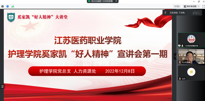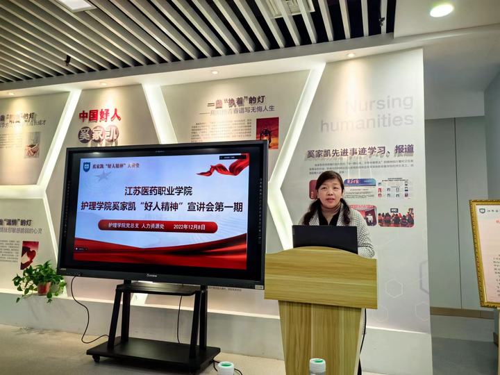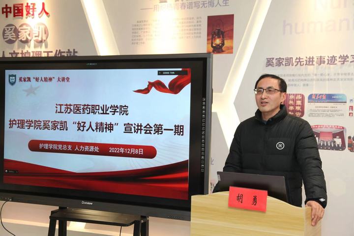 为弘扬奚家凯“好人精神”,传承道德力量,深入推进榜样引领作用,充分落实“立德树人”的根本任务。12月8日下午,护理学院党总支、人力资源处在护理学院实训中心奚家凯人文护理工作站举办奚家凯“好人精神”宣讲会。校党委副书记李玉华、宣传部部长胡勇、人力资源处副处长刘素芹、奚家凯“好人精神”宣讲团成员以及师生代表线上线下共同参加。护理学院党总支书记何曙芝主持本次活动。