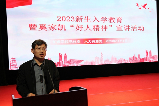 为大力宣传身边好人的先进事迹,发挥道德模范在人才培养中的引领作用,营造崇德向善、见贤思齐的浓厚氛围。11月1日下午,护理学院党总支、人力资源处在大学生艺术中心举办新生入学教育暨奚家凯“好人精神”宣讲活动。党委副书记王辉,党委委员、宣传部部长胡勇及人力资源处副处长滕达出席活动,护理学院全体教师及2023级新生参加活动。本次活动由护理学院党总支书记魏志明主持。