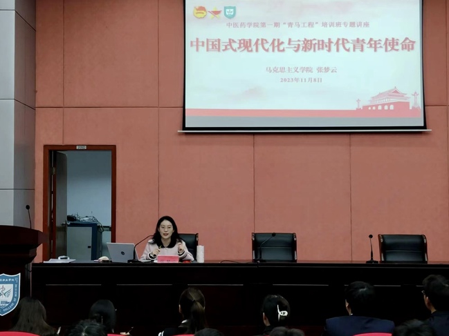 仪式结束后,马克思主义学院张梦云老师为全体学员讲授第一堂课。她从“中国式现代化的内涵”、“新时代青年与现代化的关系”等方面引导学员们深刻理解青春助力中国式现代化的重要意义。她鼓励新时代青年要勇做推进中国式现代化的奋进者、开拓者、奉献者,始终保持昂扬奋进的精神状态,让青春在全面建设社会主义现代化国家的火热实践中绽放绚丽之花。
