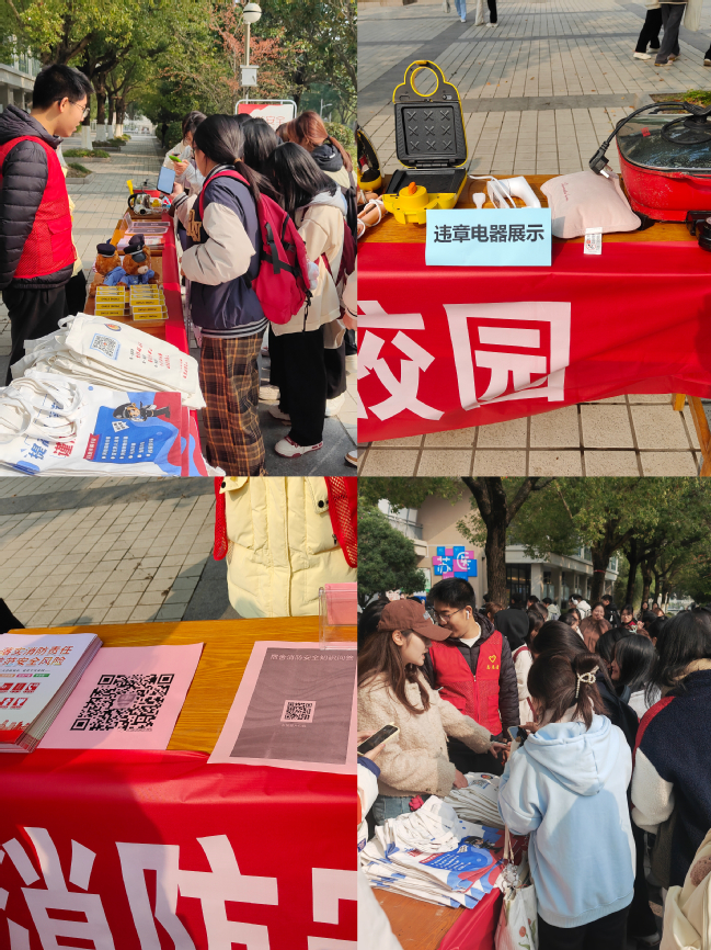 活动现场,保卫处孙璟老师向同学们讲解了安全用电细节和使用违章电器、私拉乱接电源的危害,并通过展示违章电器、发放消防知识单页、展板等形式展开宣传。现场还设置了互动环节,通过扫码回答问题的形式,吸引更多的同学参与到消防知识的学习,同学们纷纷表示出自己对共建平安校园的信心和决心。