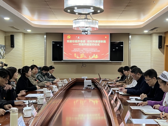 为贯彻落实党的二十大精神,进一步推进基层党建工作,提升医教协同育人水平,12月15日上午,公共基础学院直属党支部和盐城市第三人民医院机关后勤党总支开展结对共建活动。盐城市第三人民医院副院长张亚军,机关后勤党总支书记、医保处处长孔祥旺和七个支部书记以及我校公共基础学院直属党支部书记、院长殷卫红,直属党支部委员和党员代表参加活动。