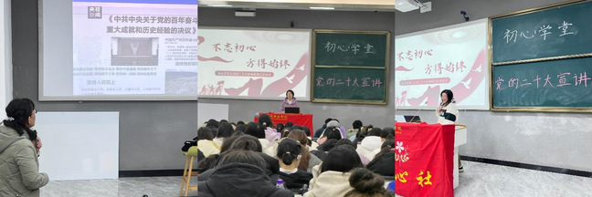 活动现场,倪风华老师带领同学们走进党史,帮助同学们了解中国共产党在不同历史时期的斗争策略、理论创新、政治智慧和精神风貌,从而更好地理解中国共产党的性质、宗旨、奋斗目标和历史使命。姚如琢老师从铁军精神出发,让同学们了解了学校的办学历程,引导同学们要牢记使命,传承铁军精神。朱碧云老师从传统文化的角度宣讲党的二十大精神,让同学们了解了中华优秀传统文化是坚持和发展中国特色社会主义的文化之根与精神之源,传承创新优秀传统文化对于弘扬社会主义核心价值观、增强文化自信具有重要意义。程慧老师和邓威威老师分别从医疗行业相关政策等方面进行宣讲。