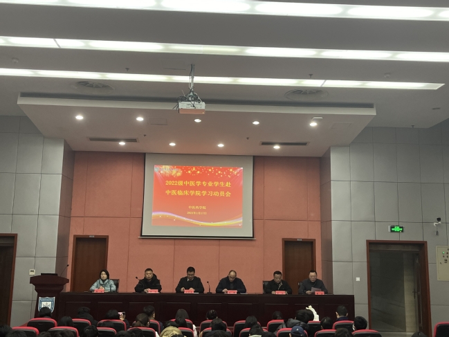 1月17日,中医药学院2022级中医学专业学生赴中医临床学院学习动员会在学术报告厅举行。保卫处副处长李理、医教协同办公室副主任潘鹏、学工处副处长刘辉,中医药学院党政班子以及全体中医学专任教师和2022级中医学专业全体学生参加动员会。副院长黄诚主持会议。