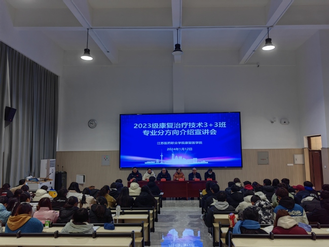 为进一步深化康复治疗技术专业现代学徒制人才培养模式改革,增强学生对各专业方向的了解和认同,康复医学院于1月12日开展康复治疗技术专业分方向宣讲会。会议邀请宿迁市中西医结合医院儿童康复科主任王耀和学院物理治疗教研室主任董新春、作业治疗教研室主任陈进进行专业介绍。学院党政班子及2023级康复治疗技术3+3班全体学生参加本次宣讲会。