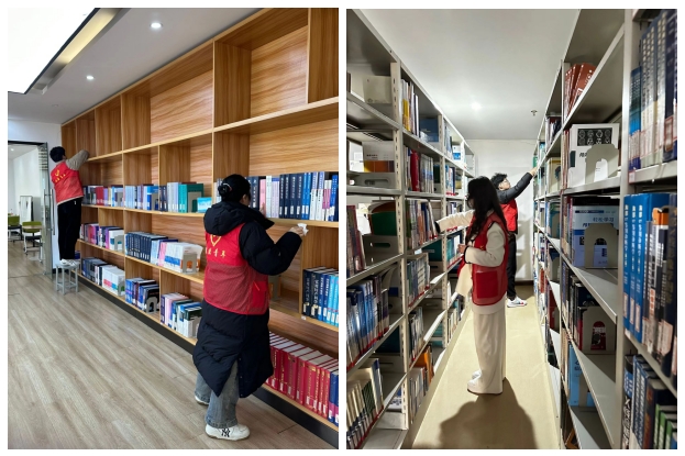 活动现场,工作人员详细介绍了图书馆的整体情况,并对来馆参加志愿服务的同学表示感谢,希望同学们在志愿服务活动中体验奉献精神。随后,志愿者们在指导老师的分工下,积极踊跃投入活动中,他们分工明确,配合默契,有的认真擦拭每一个角落,做到不留死角,有的耐心地整理着书籍,把书本按类别摆放归位,有的检查补缺图书标贴。