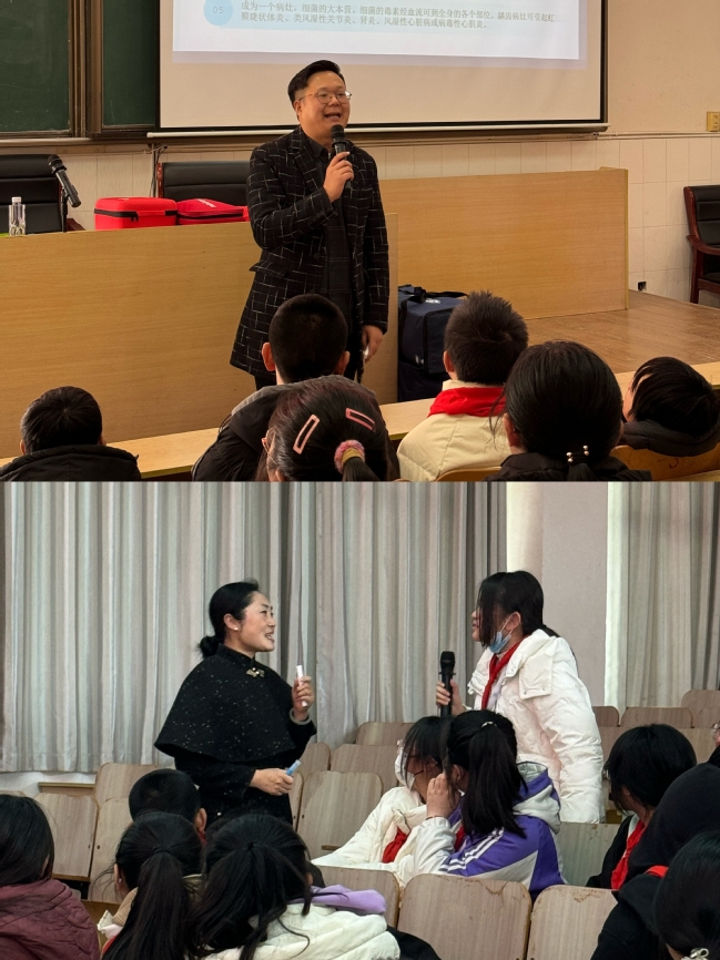 在庆丰中学,医学院蒋尚飞老师开展了“关注口腔健康”科普讲座;基础医学部张晓金老师作“了解人体奥秘”知识讲座。全体党员教师们还为庆丰中学的师生讲解了急救注意事项,并现场演示了急救操作方法。