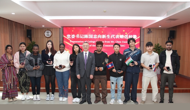 党委书记陈国忠向各国留学生新生代表赠送校徽