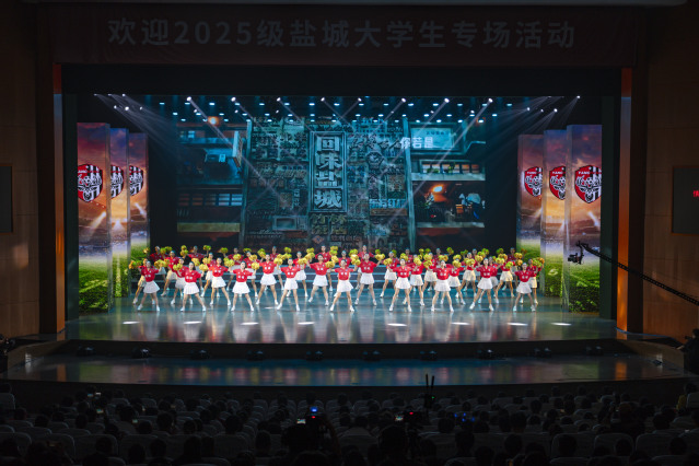 本次盐城市大学生迎新晚会上,我校啦啦操队献上的苏超主题曲《万众一心》舞蹈成为了一大亮点。队员们以激情四射、精准有力的动作,将体育的力与美完美融合,生动诠释了“万众一心”的团队精神与赛场激情。在与苏超盐城队队员花志成互动演绎时,更是瞬间引爆全场,将晚会气氛推向最高潮。
