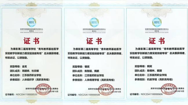 经过激烈角逐,我校基础医学部三支参赛队伍凭借扎实的专业素养与突出的教学创新能力脱颖而出,全部载誉而归。周颖婷、杜欣娜教师团队荣获人体组织学(高职高专组)金奖;陈智超、揭鹏教师团队荣获人体病理学组(高职高专组)银奖;陈根林、戴丽教师团队荣获机能学组(高职高专组)铜奖。