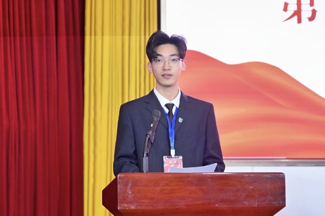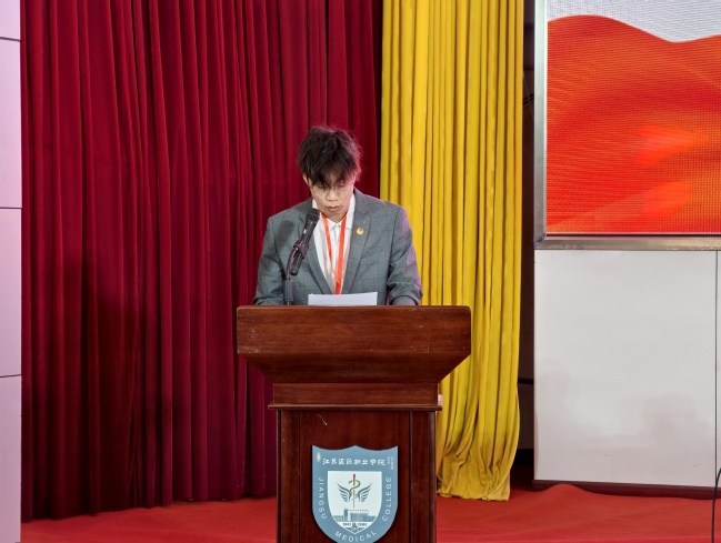 盐城工业职业技术学院学生会主席团成员王进业同学代表兄弟院校学生会致辞。他对大会的召开表示祝贺,并期望未来继续与我校学生组织携手同行,将青春的脚步紧随党的征程。