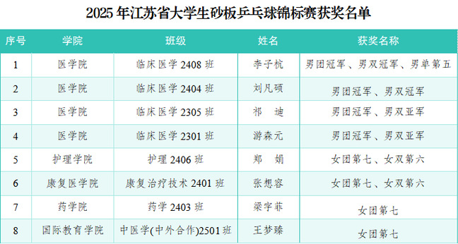 本次锦标赛我校共8名运动员参加7个项目的比赛。赛场上,我校健儿从容不迫,精准把控节奏、沉稳调整心态,凭娴熟控球与凌厉攻势抢占先机,屡夺局点、赛点,经过激烈角逐,我校健儿分别荣获男子团体冠军、男子双打冠军、男子双打亚军、男子单打第五、女子双打第六、女子团体第七的优异成绩。