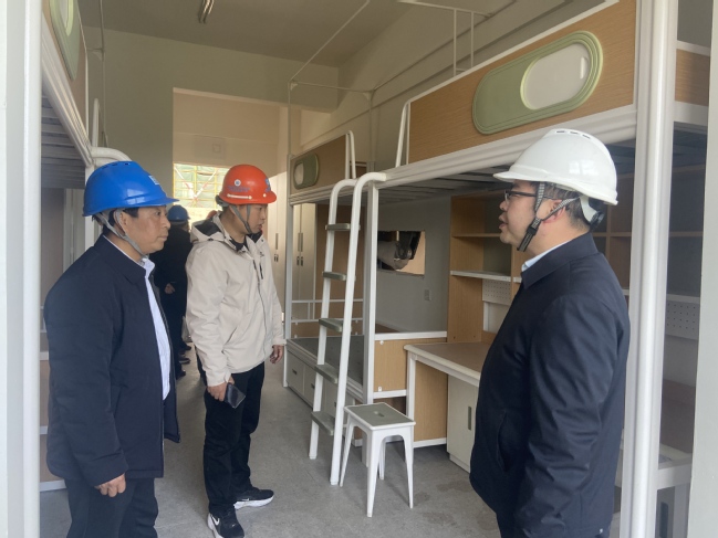 随后,徐成一行实地查看了学生公寓样板间,对空间布局、家具建材选型、生活设施配置等细节进行了细致考察,并结合学生居住需求与使用体验,提出针对性指导意见。
