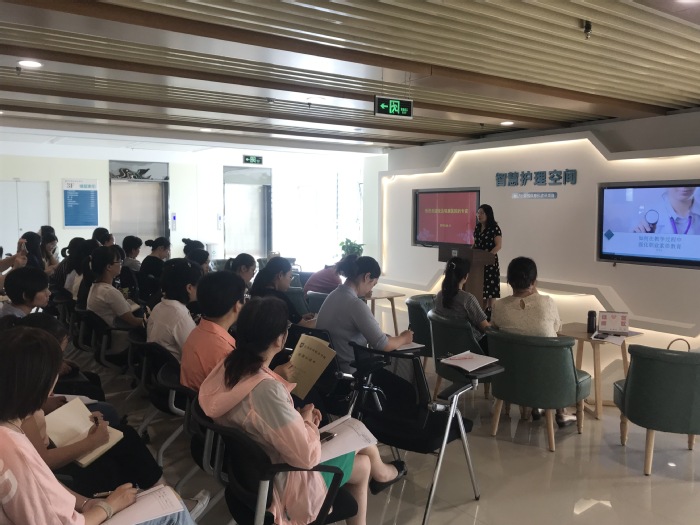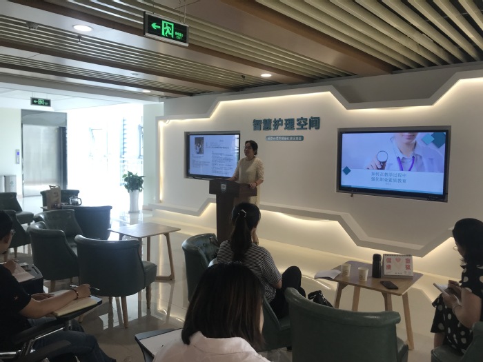 首先,悦达瑞康医院的陈金雀副院长从《设计思考改造世界》一书引申出医疗机构服务要以“人”为本,就是为了创造出无形的服务和体验。她从一个管理者的角度诠释了医院、医护人员、顾客(学生)、同理心、文化、文明和教育等几个概念及其管理经验。同时,陈院长还分享了一些经典案例让大家去理解何为同理心。随后,护理部陈亿玲主任介绍了两岸临床护理人员工作价值观差异,分享了台湾护理教育的八大基本专业核心素养、护理人员的行为特质要素、护理胜任度所需具备的核心能力以及进入职场前养成教育。讲座内容精彩纷呈,在座的老师们认真聆听的同时还不忘记下要点。