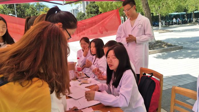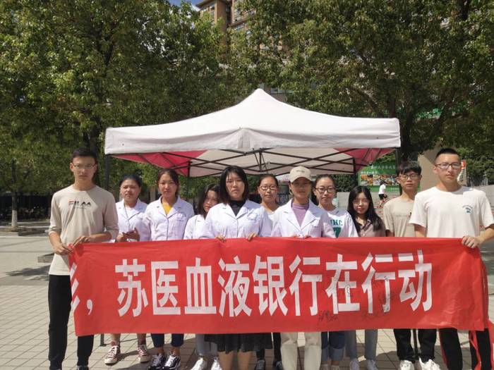 2019年9月23日,在解放校区食堂门口,苏医“血液银行”检验社团联合盐城市中心血站举办了迎国庆献血活动,社团指导老师吴芹书记、李启松老师参加了此次活动。
