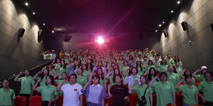 观影前,为了致敬和祝福新中国70华诞,学生们手持小红旗,与国旗合影来表达内心的激动与喜悦。在学生干部的带领下,全体观影同学面向团旗宣誓,重温入团誓词,让同学们更加深刻认识到团员青年身上肩负的责任。宣誓结束后,同学们认真观看了影片《我和我的祖国》,该部影片取材于新中国成立70年以来祖国经历的几个历史性经典瞬间,以平凡人视角再现祖国的发展,在宏大的历史视野下,用心、用情、用光影讲述的每一个我和祖国的故事。无数光辉的历史性时刻让人为之泪目,每一位平凡的华夏儿女凝聚而成的磅礴力量让人为之震撼。观影结束后,强烈的民族自信心与自豪感油然而生,在场的全体学生不约而同合唱起《我和我的祖国》,用深情的歌声为祖国母亲送上最诚挚的生日祝福。