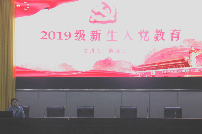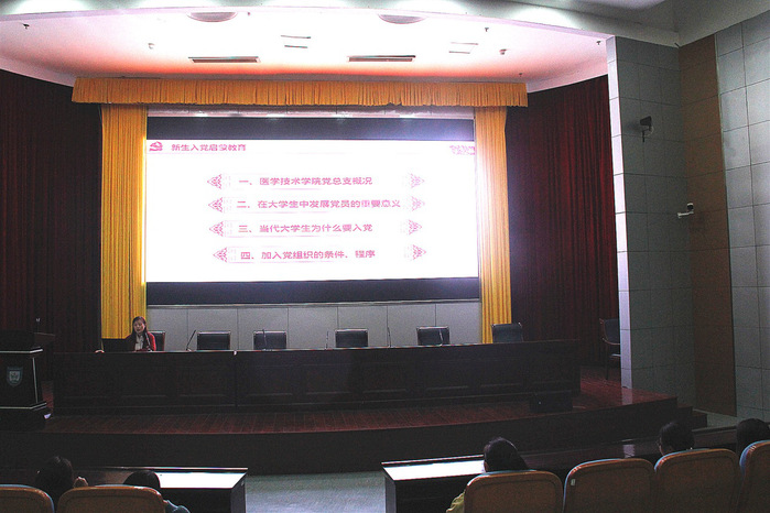 2019年10月14日晚,医学技术学院党总支在国际会议交流中心开展了2019级新生入党启蒙教育。此次教育活动由医学技术学院第一党支部书记赵霄副院长和第二党支部书记陈盛兰主讲,2019级新生参加了本次活动。