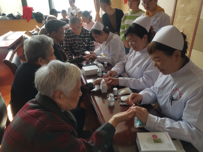 本次志愿活动分为文娱表演和健康体检两个部分。11月2日上午9:00,护理学院党员代表和夕阳天使志愿者社团学生代表为福利院的老人们带去了女生合唱《斑马斑马》、太极拳表演、诗歌朗诵《爱满人间》、师生小合唱《祖国不会忘记》等精彩节目。随着活动的深入,老师及同学们利用专业特长,为到场的福利院老人量血压、测血糖、身测量高和体重。通过开展高血压、高血糖等常见病的健康宣教,普及健康知识。最后,学院领导为老人们发放水果、生活用品等,为每位在场的福利院老人送温暖、送健康、送上美好的祝愿。