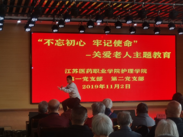 为进一步增强广大党员的初心使命教育,弘扬敬老爱老的传统美德,倡导奉献爱心志愿者精神,11月2日上午,江苏医药职业学院护理学院第一党支部、第二党支部党员教师在党总支书记何曙芝和院长夏立平的带领下前往盐城市社会福利院组织开展“不忘初心、牢记使命”主题党日活动。参加此次活动的还有盐城市社会福利院副院长陆玲、医护部王菁主任以及夕阳天使志愿者社团的学生代表。