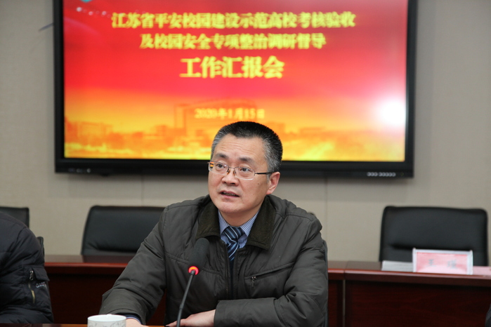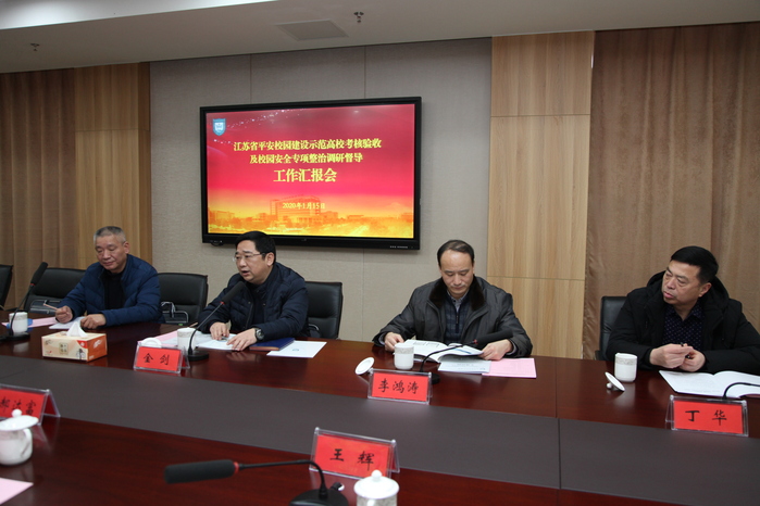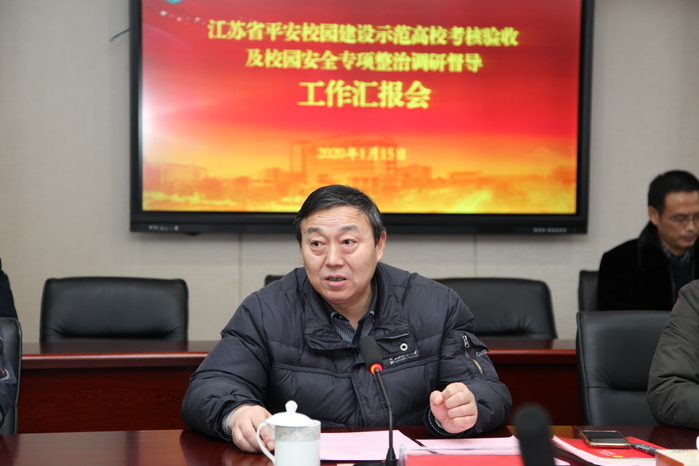 1月15日下午,由省教育厅安稳处副处长金剑、南京理工大学保卫处处长李鸿涛、南京市公安局内保支队四级高级警长武小青、泰州市教育局安保处处长丁华一行4人组成的“江苏省平安校园建设示范高校”考核督查组深入校园,对我校平安校园建设示范高校创建及校园安全专项整治工作进行现场考核督查。学校党委书记郝达富,院长陈国忠,副院长王辉、侍杏华,相关部门负责人参加了会议。